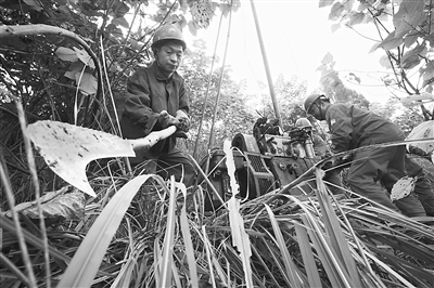 四川剑门关,两名钻井员工深入丛林进行打眼钻井作业。“射箭河—河湾场构造二维勘探”项目位于四川盆地西北边缘,属高山地带,相对高差900米,植被茂密。汶川大地震过后,这里更是路途险峻。就在这样的环境中,石油勘探的铁军——川庆物探队用人拉肩扛的方式挺进人迹罕至的丛林区,以坚韧的毅力走过了一条又一条测线,取得了一个又一个勘探成果。金添 摄