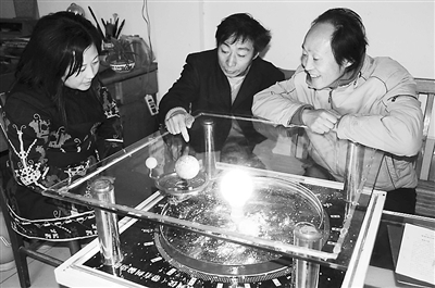 “你看,这是日食、这是月食……”张家云插上电源,“地球”自转的同时,随着“太阳”公转,而“月亮”也会随着“地球”公转。“它能直观地显现地、月、日天体之间的运动、昼夜变化、四季更迭、日食、月食、月缺月圆原理和农历节气等等。”