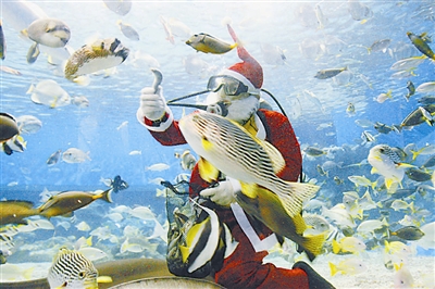 12月9日,在位于菲律宾首都马尼拉的海洋公园,装扮成圣诞老人的潜水员在水下喂鱼。