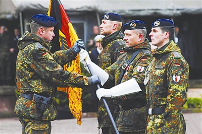 12月10日,德国第291歼击营正式进驻法国东部城市斯特拉斯堡,成为二战后首支进入法国领土的德国军队。图为德国士兵参加德国第291歼击营驻扎授旗仪式。谢涛 供图