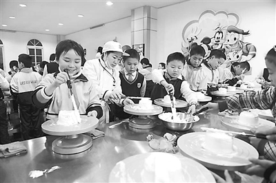 12月13日,留守儿童(黄色运动服)与朋友们一起做蛋糕。当日,重庆市大渡口区教委“手拉手”活动正式举行,60余名留守儿童与城区多所小学的孩子们一起手拉手做蛋糕、送礼物,度过愉快的一天。新华社记者 陈诚 摄