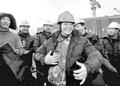 12月8日,沈阳市府恒隆项目施工工地的农民工正在试穿获赠的羽绒服。当天,沈阳市总工会“给农民工送温暖主题活动”在市府恒隆项目工地举行,全市各级工会组织赶赴一线慰问农民工,为农民工送上冬日的温暖。 大海 摄