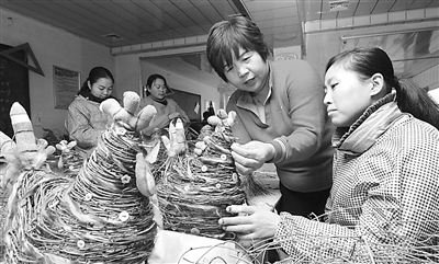图为投放国外圣诞节日市场,夏红丹和妇女们抢编藤条公鸡。