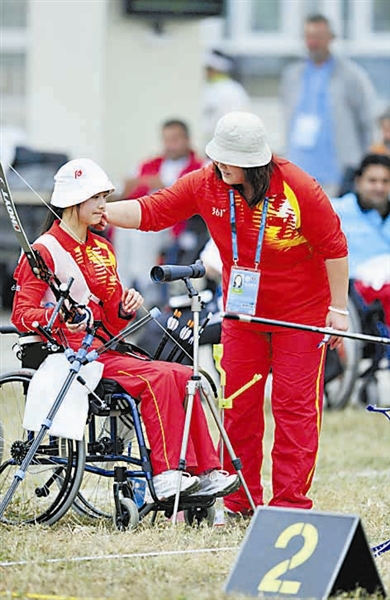 12月13日,在广州2010亚残运会射箭女子反曲弓排名赛中,中国选手袁露露(左)的教练金玉兰为她擦汗。