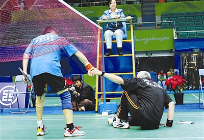 12月14日,中国选手田时伟(左)比赛中越过球网搀扶马来西亚选手朱哈里。当日,在广州2010亚残运会羽毛球男子单打站立一级半决赛中,马来西亚选手MD·拉迪·朱哈里在比赛中摔倒。中国选手田时伟上前将其扶起继续比赛。新华社记者 王松 摄