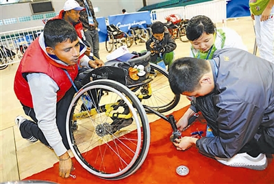 12月15日,一名工作人员为运动员维修轮椅。当日,2010亚残运会轮椅网球的比赛继续在广州天河网球学校举行。在运动员休息区专门设有一个为选手们维修和存放轮椅的中心,为他们的“战车”提供保养、维修和存放服务。新华社记者 岳月伟 摄