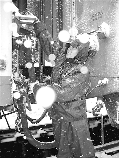 12月15日,在江西九江铁路客技站,南昌车辆段的职工正在顶风冒雪接挂客车电力连接线。当日,江西大部分地区迎来今年入冬以来首场大雪。南昌铁路局积极采取应对措施,确保京九铁路、昌九高铁安全畅通。胡国林 杜勒彪 摄