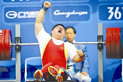 12月16日,中国选手顾小飞庆祝夺冠。当日,在广州2010年亚残运会男子82.50公斤级举重比赛中,顾小飞以215.0公斤的成绩夺得金牌,并以222.5公斤的成绩打破世界纪录。新华社记者 摄