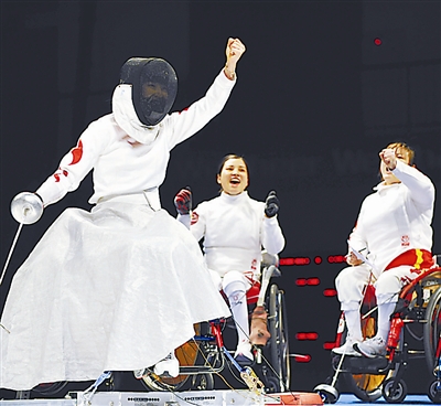12月16日,荣静(左一)得分后兴奋地挥舞拳头。当日,在广州2010年亚残运会轮椅击剑女子重剑团体赛中,由荣静、伍百丽、姚芳、叶华组成的中国队战胜中国香港队,获得冠军。