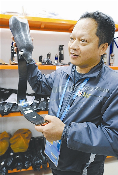 12月15日,工作人员在运动员村义肢维修中心展示一支价值4万余元的碳纤维运动义肢。