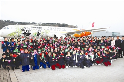 12月18日,迎接“开开”“心心”的澳门小学生与各界嘉宾在澳门国际机场大熊猫专机前合影。当日,中央政府赠送澳门特别行政区的两只大熊猫“开开”“心心”乘专机抵达澳门国际机场,随后被送往澳门路环石排湾郊野公园大熊猫馆。 新华社记者 张金加 摄