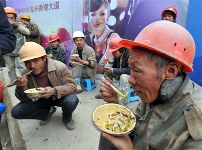 12月19日中午,贵阳市一在建的楼盘前,建筑农民工在吃流动摊贩提供的午餐。他们的午餐6元钱一份。一位农民工说,他们很希望老板能为工人着想,设立一个食堂,劳累了一天能吃口热饭。可是,长期以来,吃饭的事一直困扰着他们。吴东俊 摄