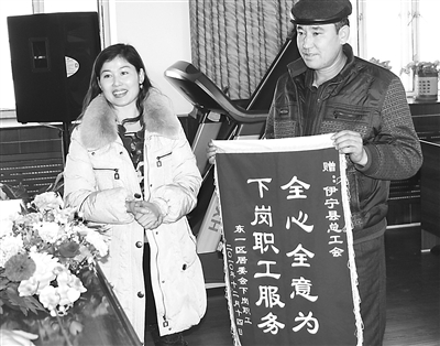 12月17日,新疆伊宁县原红山煤矿下岗职工吾甫尔·库尔班(右)将一面锦旗送到县总工会领导的手中,感谢县总工会圆了他孩子的大学梦。今年,伊宁县总工会在全县范围内开展“金秋助学”活动,将18名困难职工子女送进大学,受到社会的高度赞扬。钟改清 朱磊 摄