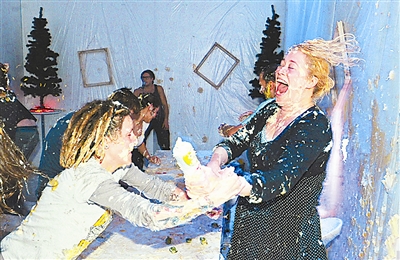 12月18日,英国伦敦一家画廊举行了圣诞食物大战活动。在活动中人们用甘蓝、土豆泥、果冻及奶油等食品互相“攻击”,此活动的门票收入将捐献给慈善机构。 阿健 供图