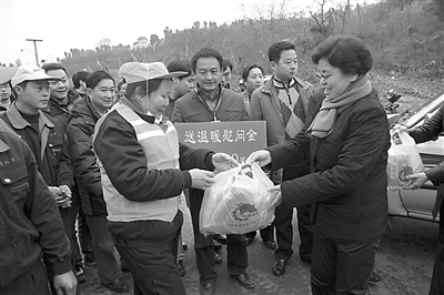 12月21日,四川省委常委、省总工会主席李登菊(右一)在成都主会场宣布“四川工会2011年元旦春节送温暖活动”启动后,立即赶往“成都市固体废弃物卫生处置场”为一线职工送上慰问金和慰问品。