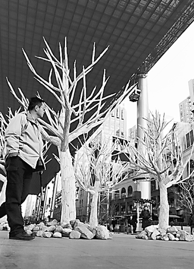 12月19日,国际环保组织绿色和平在北京世贸天阶举办“我本是一棵树”公众参与活动。20所大学的200多名志愿者经过3个星期的努力,到餐馆搜集使用后丢弃的一次性筷子8万余双,拼接还原成4棵高约5米的大树。