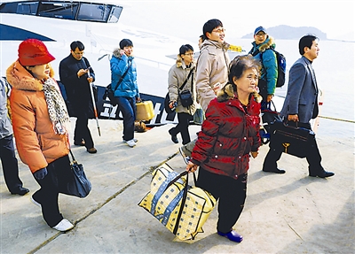 12月21日,韩国仁川港前往延坪岛的航线重开。图为复航后首艘民用船只抵达延坪岛码头,前几天离岛外出躲避战火的岛上居民正上岸准备回家。吉平 供图