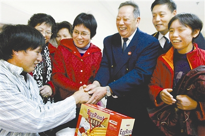 12月22日,全国劳动模范杨怀远、陶依嘉、樊水玉,上海市劳动模范朱慧娟,全国职工职业道德先进个人金康生、原全国政协常委、著名社会学家邓伟志等,手捧着鲜花来到上海宏康医院看望感动沪上的送奶工金友生。今年7月29日清晨,金友生在送奶时被啤酒瓶碎玻璃扎伤,右脚跟腱几乎被割断,但他咬着牙坚持送奶,最终因失血过多而昏迷。临近年底,上海各界人士纷纷前往医院探望表示敬意。陈焕联 摄
