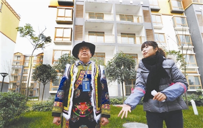 12月23日, 绵阳北川县,原在北川老县城开旅馆的李国军(左)和女儿最早抵达尔玛小区找新家。当日,北川羌族自治县老县城3534户居民摇号分房,分得住房的人们纷纷涌向北川新县城的住房小区,寻找他们的新家。