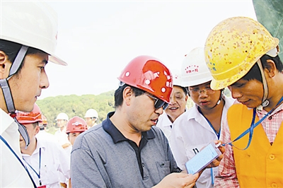 为了让工人在铁路建设现场施工中按标准进行作业,中铁一局南广项目部将桥梁、隧道、路基等作业标准制作成了《工序卡》让作业人员挂在胸前,可以随时查看,有力促进了现场标准化作业。图为铁道部安监部门领导在现场查看工人们佩带的《工序卡》。张纪平摄