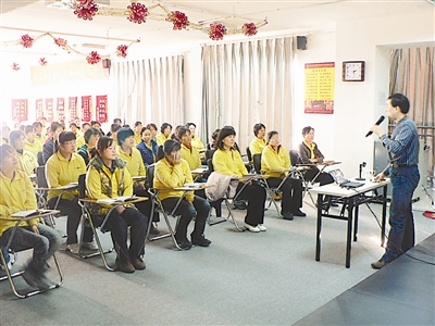 “农民工心理健康学校”没有自己的固定教室。图为心理医生在家政公司提供的场地为农民工们授课。