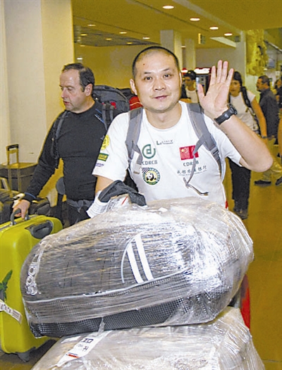 12月26日,中国成都农商银行车队车手周远德在机场向欢迎人群挥手致意。当日,周远德抵达阿根廷首都布宜诺斯艾利斯,准备参加明年1月1日发车的2011年达喀尔拉力赛。 新华社发(马丁·萨巴拉摄)