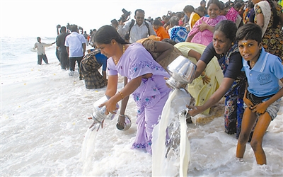 12月26日,在印度泰米尔纳德邦首府金奈的马里纳海滩,人们向海中倾倒牛奶,悼念海啸遇难者。