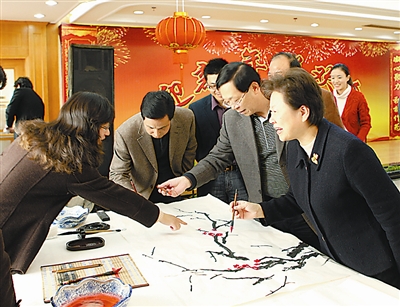 图为福建省总工会领导在联欢会上共绘迎春图。