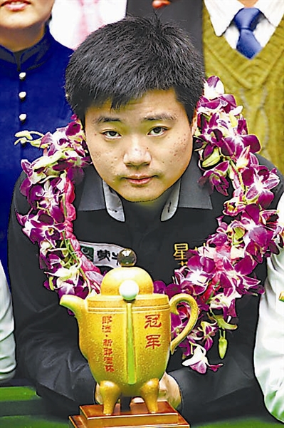 12月30日,获得冠军的丁俊晖在颁奖典礼上。当日,2010斯诺克中国巡回赛总决赛在江苏省宜兴市体育中心落下帷幕,丁俊晖以5比2的比分战胜梁文博,获得冠军。新华社发(丁焕新 摄)