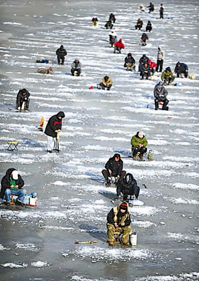 12月30日,冬钓爱好者在冰面上钓鱼。近日,天津的冬钓迷们开始在海河结实的冰面上冒着严寒冬钓。冬钓迷一般在早晨8~10点左右,冒着零下5~6摄氏度的严寒,在海河的冰面上凿开三两个小窟窿,放下鱼竿坐等鱼儿上钩,享受冬钓的乐趣。新华社记者 岳月伟 摄
