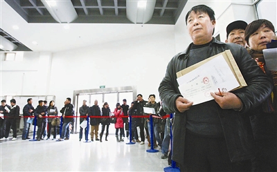 2010年12月30日,上海,一早前来订票的外来务工人员在排队等候办理订票。上海铁路部门当天启动了外来务工人员团体订票服务。有了铁路团体订票,外来务工人员不再担心买不到回家的车票。杨毅 摄