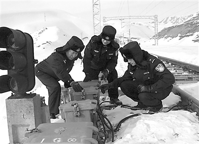 图为奎屯铁路公安处尼勒克车站公安派出所民警检查信号机转辙器的工作状态。白云 摄
