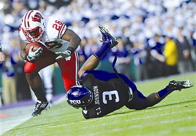 1月1日,威斯康星大学队选手鲍尔(左)在比赛中进攻。当日,第97届“玫瑰碗”美式橄榄球赛在美国加州帕萨迪纳玫瑰碗体育场举行。作为传统的庆祝新年的活动,一年一度的“玫瑰碗”美式橄榄球比赛成为年度重要赛事,深受美国人民喜爱。本届比赛由威斯康星大学队对阵德克萨斯基督教大学队。 新华社记者 戚恒 摄