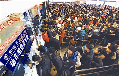 1月3日,大批旅客在江西九江火车站售票处排队购票。新华社发 胡国林 摄