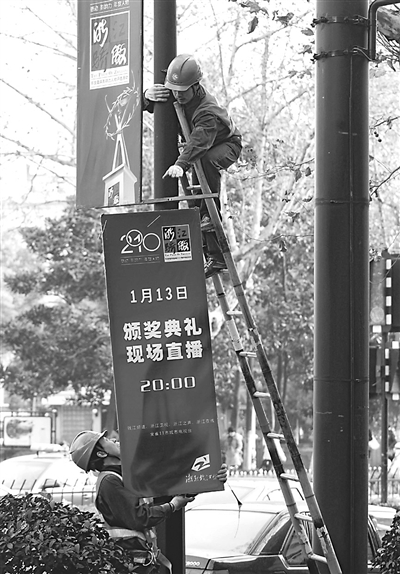 1月4日,两名安装工人在杭州主城区一条街道边悬挂广告牌。