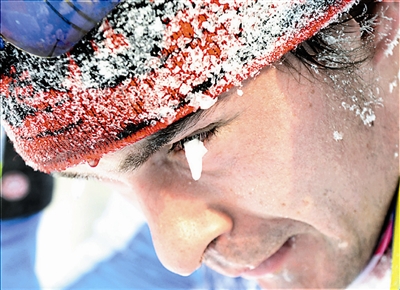 1月2日,一名参加2011年中国长春净月潭瓦萨国际越野滑雪节暨国际雪联长距离积分赛选手的睫毛上也“挂上”了“冰凌”。新华社记者 徐家军 摄