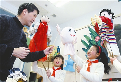 1月5日,在中福会少年宫木偶活动小组,上海普陀区金鼎学校梅川路分校的学生们在进行表演排练。当日,由上海市慈善基金会、上海关心下一代研究中心主办的“爱心助我高飞——关爱外来务工人员子女成长展示活动”在中福会少年宫举行。上海多所民办小学的外来务工人员子女展示了在爱心企业和社会力量的帮助下,他们在少年宫学习和开展的丰富多彩的才艺活动。 新华社记者 刘颖 摄