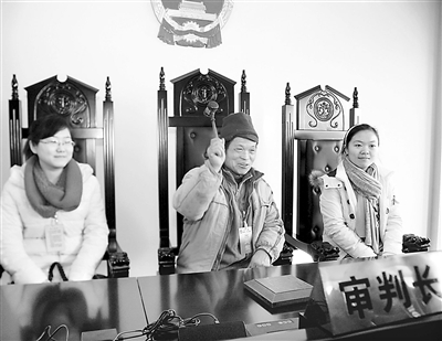 1月6日,河北省的企业职工、高校学生以及农民工等社会各阶层的代表来到该省高级法院,参加该法院的首个“公众开放日”活动。在一法庭里,一位农民工饶有兴致地坐在审判桌前,模仿审判长办案敲打法槌,体验了一把“开庭审案”。翟羽佳 摄