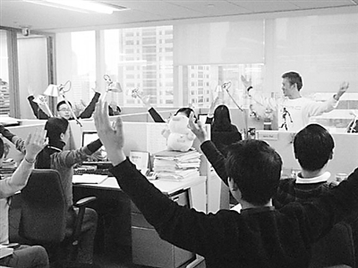 赵列颖正在电脑前埋头工作,突然,随着一道欢快的乐声,一行提示信息出现在电脑屏幕上,她立即放下手头的工作,站了起来,伸腿、弯腰,展臂……当然,整个办公室里的人都像她一样,跟随着音乐节奏扭动起身体。