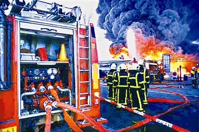 1月5日,荷兰穆尔代克小镇一化工厂发生爆炸。当局警告居民呆在家中并将房门窗户紧锁,以防爆炸物伤人。图为消防队员冒着化工厂发出的滚滚浓烟正在扑灭大火。吉平 供图
