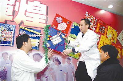 医院党政领导向全院职工发放了新年慰问品,各部门职工也纷纷将他们精心制作的五彩缤纷的新年寄语牌匾张贴到巨幅背景板上。慰问活动在热烈、欢快、祥和的气氛中圆满结束。 (陈亚伟摄)