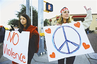 图为美国亚利桑那州民众手举反对暴力的标语牌,参加悼念遇难者活动。肖劼 供图