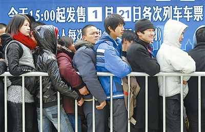 1月11日,旅客在上海火车站排队等候领取购票号牌。由于客流集中等原因,上海站发往云南、贵州、四川、黑龙江等方向的票源依然很紧张,不少购票者早上5点就前来排队。新华社记者 裴鑫 摄