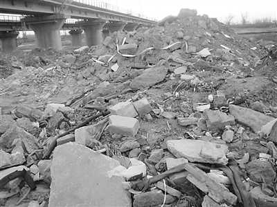邻近北京的河北燕郊近年来成了一个大工地,很多北京人在这里买房,因为房价低一些。新建这么多大楼所产生的建筑垃圾被运往了哪里?开大车的司机告诉笔者,钻过白庙桥的桥洞,往南走200米,是建筑垃圾比较集中的地方。果真,那里的建筑垃圾约有400米长,一直延伸到干涸的潮白河上。实习生 王奇 摄