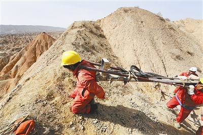 在塔里木塔格大山里找油,因特殊地貌无法采用机械化运输,中国石油川庆公司的职工只能手拉肩扛将勘探设备运到作业现场,各种令常人无法想象的困难时刻伴随着他们……本报记者 于文国 摄于2009年3月19日