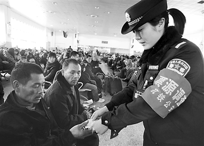 2011年春运即将开始,杭州火车站派出所针对今年春运新特点,在候车室不断开展旅客票源调查,提前排查“黄牛”倒票线索,打压违法犯罪分子活动空间,维护广大旅客的合法权益,提供良好的乘车秩序和环境。高再新 摄