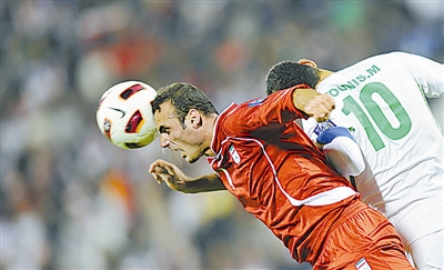 1月11日,伊朗队球员贾拉勒·侯赛尼(左)在比赛中和伊拉克队球员尤尼斯争顶。