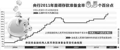 本报北京1月14日电(记者董沛)通胀率居高不下,以及流动性泛滥,促使中国人民银行今天宣布,将从1月20日(下周四)起上调金融机构人民币存款准备金率0.5个百分点。