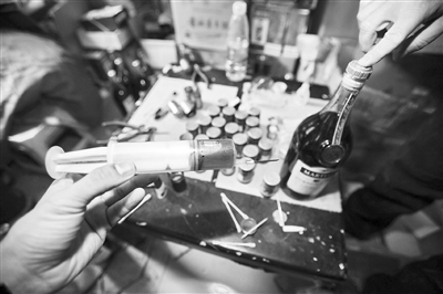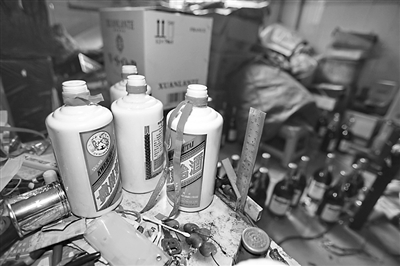 据调查,造假者将劣质酒灌入空瓶,重新包装,一瓶瓶“茅台”、“蓝带”、“轩尼诗XO”、“剑南春”就这样新鲜出炉了。