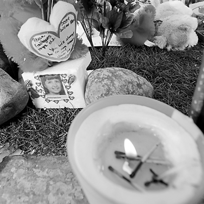 亚利桑那州枪击案发生当晚,当地民众点燃蜡烛,为枪击事件受害者祈福。这是在图森市亚利桑那大学医疗中心外纪念年仅9岁死难者的照片和纪念物。